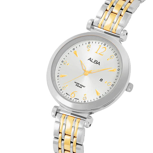 The Alba watch offers a perfect blend of elegance and contemporary charm. Featuring a captivating dial, this watch is complemented by exquisite gold-tone markers and hands, creating a striking contrast that enhances its luxurious appeal. The subtle gold accents add a refined touch, making it a versatile accessory for any occasion.
