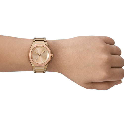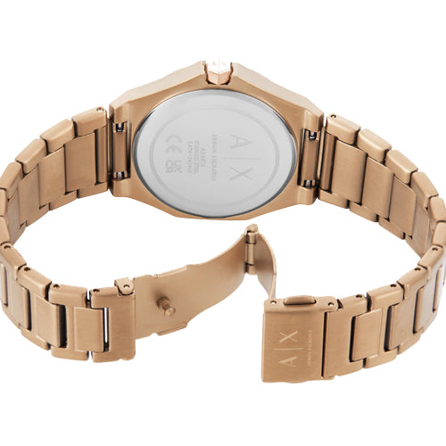 Armani Exchange's 34mm watch features a beige gold brushed dial, rose gold bezel, three-hand movement and beige gold-tone stainless steel bracelet.