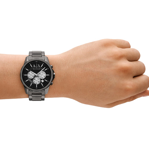 Armani Exchange's 44mm watch features a black sunray dial, chronograph movement and gunmetal stainless steel bracelet.