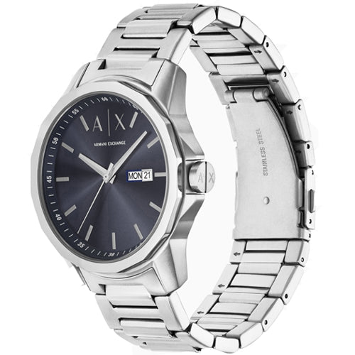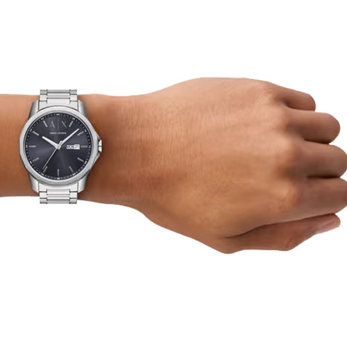 Stainless and sleek, the Three-Hand Day-Date Stainless Steel Watch for men features a striking 44mm round case. The blue sunray dial is paired with a practical day-date function, all powered by reliable quartz movement. The silver-tone stainless