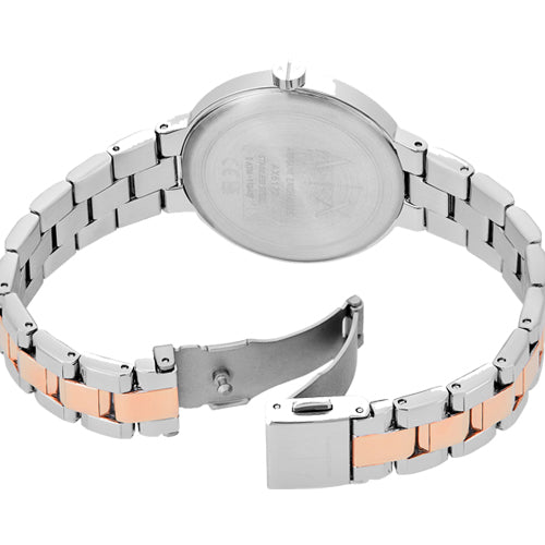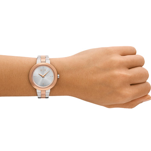 Armani Exchange's 36mm watch features a silver sunray dial, two-hand movement and two-tone stainless steel bracelet.