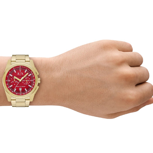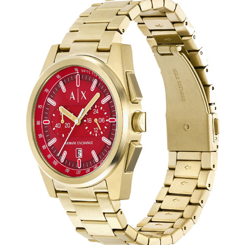 This 42mm chronograph watch features a striking red matte dial that captures attention. The gold-tone stainless steel bracelet adds a touch of luxury, while the durable mineral crystal protects the dial. Powered by precise quartz chronograph movement, this watch combines style and functionality, making it a standout accessory for any occasion.