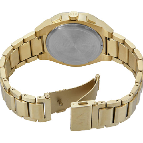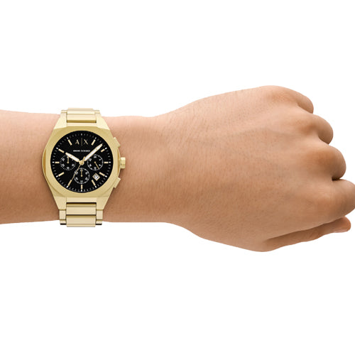 Armani Exchange's 42mm watch features a black sunray dial, chronograph movement and gold-tone stainless steel bracelet.