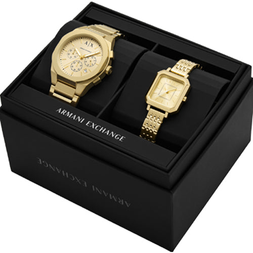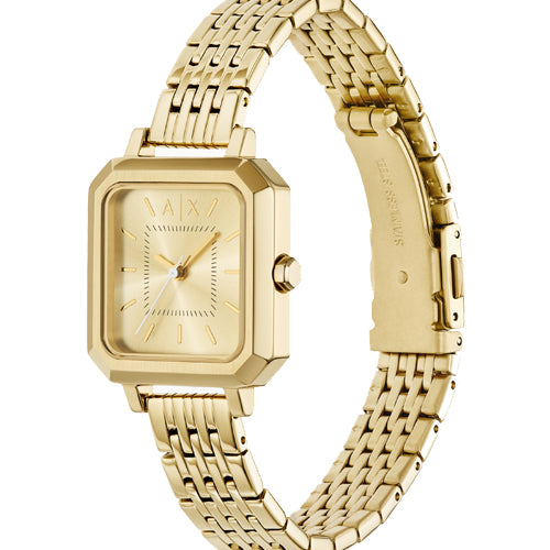 A gold sunray dial catches the light with a subtle shimmer, framed by a polished gold-tone stainless steel case. The black leather strap adds a refined contrast, balancing texture and tone. With its minimalist two-hand design, this watch delivers effortless sophistication in a sleek, modern silhouette.
