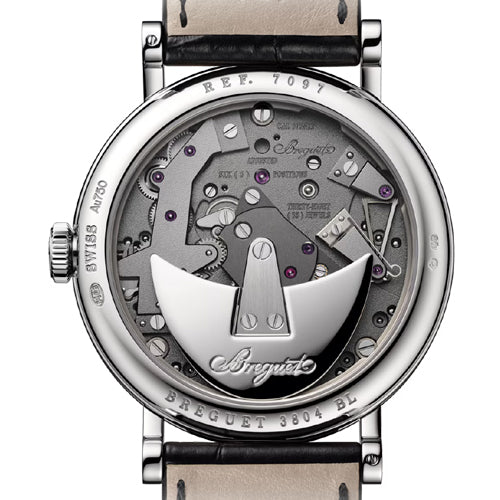 Superimposed on the emblematic off-centred dial, the small seconds are indicated at 10 o’clock thanks to a retrograde hand. Entirely symmetrical, this watch leaves no doubt that it belongs to the Tradition collection. The bridges, wheels, escapement, barrel and other components of the movement, usually hidden beneath the dial, are here exposed on the main plate. Another highlight of the timepiece is the pare-chute located at 4 o’clock. This Breguet invention protects the pivots of the balance wheel from impact. It is the forerunner of the modern “Incabloc” and all other shock protection mechanisms.