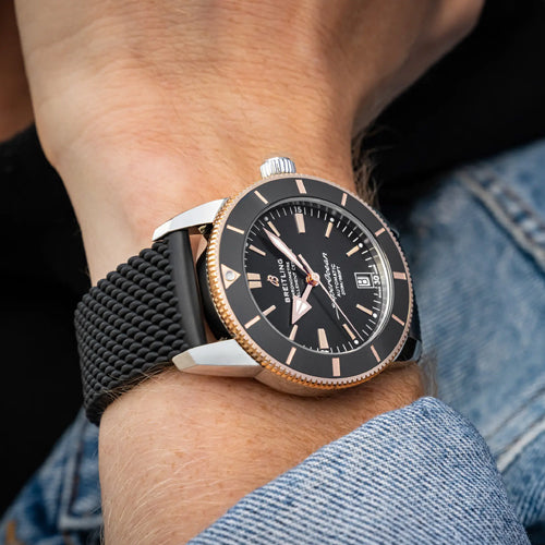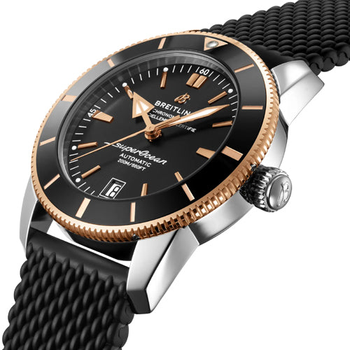 Silver-tone stainless steel case with a black rubber aero classic strap. Uni-directional rotating black and rose gold 18kt rose gold and ceramic bezel. Black dial with rose gold hands and index hour markers. Minute markers around the outer rim. Dial Type: Analog. Luminescent hands and markers. Date display at the 6 o'clock position. Breitling Calibre 20 automatic movement with a 70-hour power reserve. Scratch resistant Sapphire Crystal. Screw down crown. Solid case back.