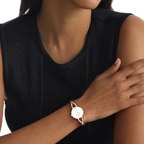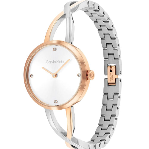 Elevate your style with the Calvin Klein Elation 25100060 Women’s Watch. Featuring a sleek round dial in radiant gold tone, this timepiece blends minimal elegance with a luxurious feel. The silver-white face with subtle stone markers adds a touch of sparkle, while the intertwined dual-tone bangle strap brings a modern edge.