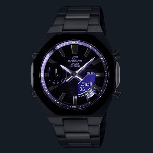 This Outlet store product may not have original packaging or may be missing a manual. The product itself is in new condition. The ERA200 is the first model in the EDIFICE line to be equipped with a direction sensor with bearing memory. Just press the direct compass button, located at the 3 o'clock position, and the second hand immediately points north, no matter what mode the watch is in. The face of the ERA200 boasts a multi-dimensional look, integrating digital and analog design in order to clearly display information provided by various watch functions. Stainless steel analog watch with black face.