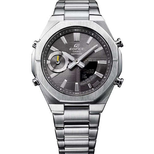 Work hard and play hard with a slim, sporty analog-digital combination EDIFICE that’s serious about both business and fun. These timepieces deliver lightweight wearability and smartphone connectivity, all in a slimmed-down, less-than-10-mm case that won’t get caught in your shirt cuff. Sync with your smartphone via Bluetooth® for automatically adjusted precision timekeeping. Tap into the app to effortlessly manage world time no matter where your travels take you. Whether for business or pleasure, international trips are seamless with automatic updates for local time and daylight savings. The app also makes managing alarms, times, and other features easy and intuitive. The Super Illuminator lights up the watch hands and digital display with high-brightness LED, and sapphire crystal protects against scratches for a clear and easy read. A slim, truly comfortable chronograph that meets the exacting specs that Casio partner racing teams demand.