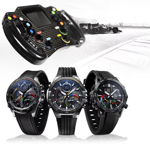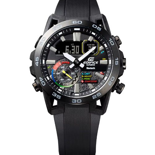 Hold your own, with true motorsports form, functionality, and sophistication in an EDIFICE racing multicolor timepiece. The bold dial is accented with colorful touches inspired by the layout of race car steering wheels. The second display and other color-coded components ensure the stand-out visibility that racing teams need for split-second decisions and quick action. The soft urethane band delivers an extremely comfortable fit, leaving you free to focus on more exciting things. Sync with your smartphone via Bluetooth® for precision timekeeping, wherever you go. Simply tap on the app to effortlessly manage functions like selecting a city from the World Time list. Developed to meet the needs of racing teams, the schedule timer syncs with your smartphone’s calendar app to transmit schedule items to the phone and display start and end times on the watch. The fully automatic LED light illuminates the dial and LCD with just a tilt of the wrist.