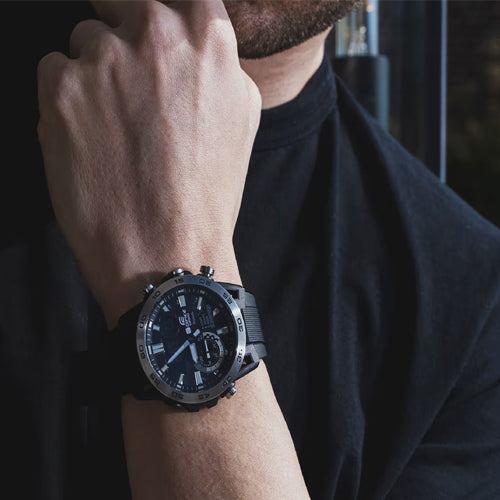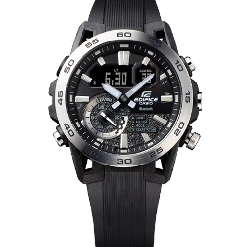 Introducing true motorsports form, functionality, and sophistication — the EDIFICE SOSPENSIONE ECB-40, with carbon fiber reinforced resin suspension arm design and Smartphone Link. The unique case design is inspired by formula car suspension with lugs configured in a four-arm arrangement, two above and two below. Carbon fiber-reinforced resin delivers a case that is lightweight, yet strong. Thanks to Smartphone Link, this special timepiece automatically connects when within range of a paired smartphone. Tap into the app to access functions that are so important for racing teams — get automatically adjusted to-the-second precision timekeeping, effortlessly manage world time, and transfer stopwatch data measured to the millisecond for up to 200 lap times to your smartphone. The Super Illuminator high-luminosity double LED illuminates the digital-analog display for easy readability, even in the dark.
