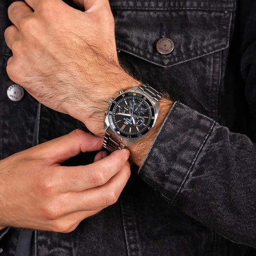 A large standard chronograph. The extra-thick bezel, six screws, and extra-thick inner dial and indices create a powerful and sporty design. The bezel is treated with a scratch-resistant black IP.