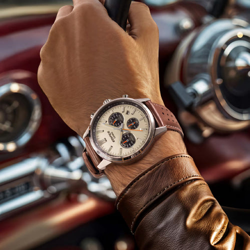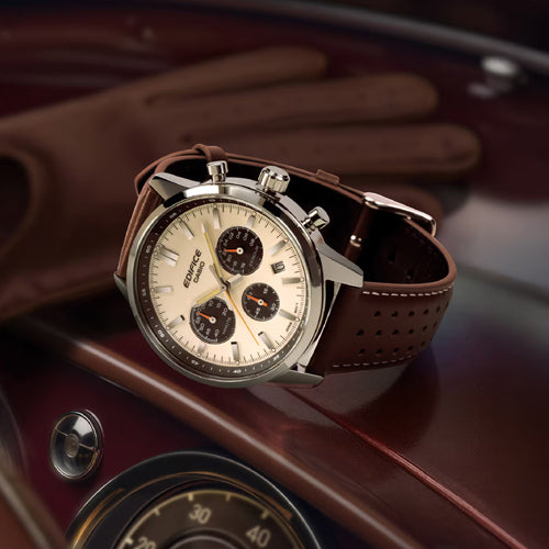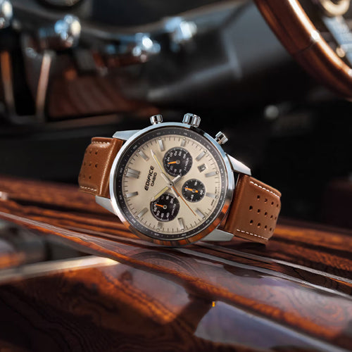 The EDIFICE chronograph inspired by the convex glass gauges of the classic sportscar. The two-tone dial features contrasting colors for the main and inset dials, evoking the look of a classic sportscar’s instrument panel. Details like the convex domed watch glass, stainless-steel case with narrow bezel, and push buttons round off the design with time-honored style.