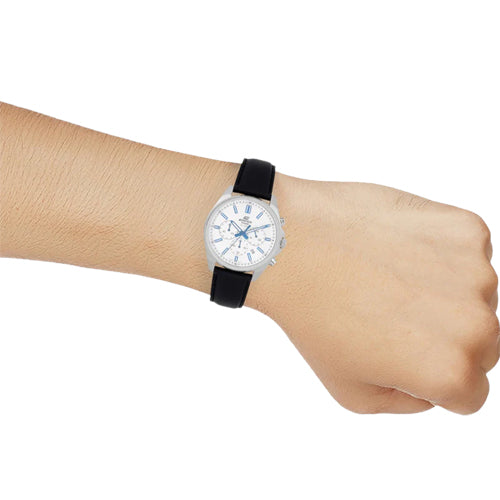 Strike just the right chord with a mid-sized classic EDIFICE chronograph. The sophisticated pairing of fine detail and design features a thin bezel offset by a wide dial for striking, elegant style.