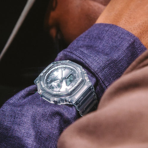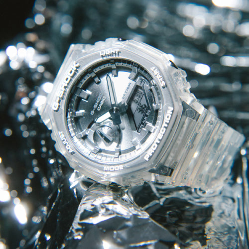 The shimmering color and cool translucence of the GA-2100BM. The GA-2100 with octagonal bezel is paired with a dial finished in metallic vapor deposition in popular color — silver — offset by a translucent band for a confidently cool look.