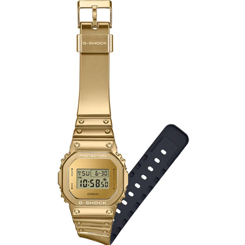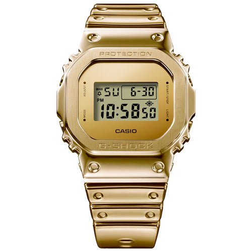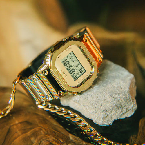 G-STEEL daring meets sophisticated gleam in monochromatic gold color scheme. The monochrome aesthetic pairs a metal bezel colored gold with a newly developed tough silicone band in the same color. The surface of the band is protected with a urethane sheet finished with vapor deposition in gold to achieve a metallic glimmer in a band that feels great against the skin. Soft and comfortable to wear, with a glittery metal look, these timepieces are fashion items that take you wherever you want to go. Choose your favorite — the iconic GM-5600 with its classic digital style.