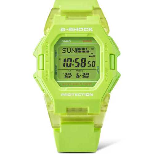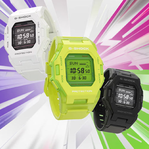 A compact G-SHOCK in a boldly straight-forward design that moves style into the future. The tough digital GD-B500 goes smaller and slimmer to meet today’s needs, delivering just what you require from a watch in a minimalist design with a futuristic sensibility. With a case measuring just 46.3 mm in diameter and 11.0 mm slim, this G-SHOCK is significantly smaller than past models. Even this small, it comes equipped with Bluetooth and a step tracker so that you can easily take control of your daily exercise. Choose classic black or white, or go with the GD-B500S-3 in dynamic fluorescent yellow with translucent band connectors. Effortlessly stylish, the GD-B500 holds the key to all-new possibilities with G-SHOCK.