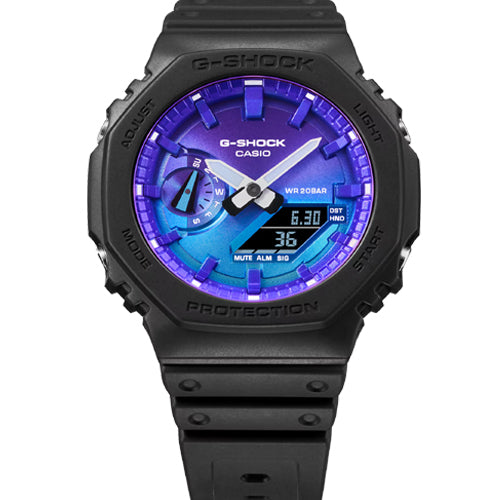 Fiery and bold G-SHOCK watches glowing with flames of awesome color. -SHOCK is all about taking on challenges, and the vivid colorful gradation of the Flame Inside line puts this blazing passion front and center. Beginning with the GA-100 with distinctive large case and the GA-2100 with octagonal case, the design brings in motifs of billowing smoke for the band and features a brightly burning dial in flames of blues or oranges. Choose your favorite look — the GA-100FL-1A or GA-2100FL-1A with vivid blue dial and gradated gray-on-black body, representing the hottest flames of conviction against rising white plumes of smoke; or the GA-100FL-8A or GA-2100FL-8A with bold orange dial and gradated black-on-gray body, evoking flames of fiery passion against a dark smoky backdrop.