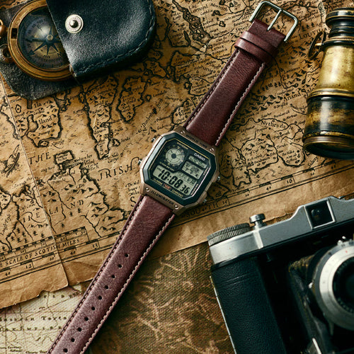 Bold style, practical functionality — a new take on multifunctional digital watch design inspired by the love of gadgetry. The digital dial on the upper left keeps the time back home on constant display, even as you use features like the stopwatch. The world map at the upper right synchronizes with the current time on the LCD below so you can easily keep track of where you are on the journey. This heavy-duty player is packed with reliable, handy features like 10-year battery, water resistance up to 100 meters, LED backlight, stopwatch, and more.