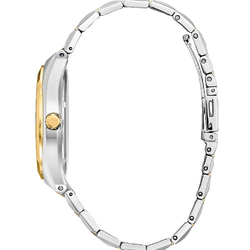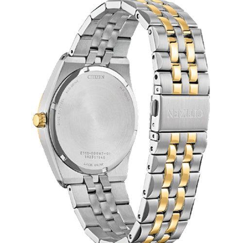 A classic timepiece is always in style in the Corso men’s watch from Citizen. Featuring a two-tone gold and silver-tone stainless steel bracelet and case with a 3-hand white dial and date indicator, luminous hands and gold-tone markers, this elegant timepiece also features a fold-over clasp closure with hidden push buttons and is water resistant to 100 meters. If you’re looking for a dress watch to add classic style to your wardrobe, look no further – the Corso is the perfect choice. It also uses Citizen’s Eco-Drive technology, so it is sustainably powered by any light and will never need a battery. Caliber number E111.