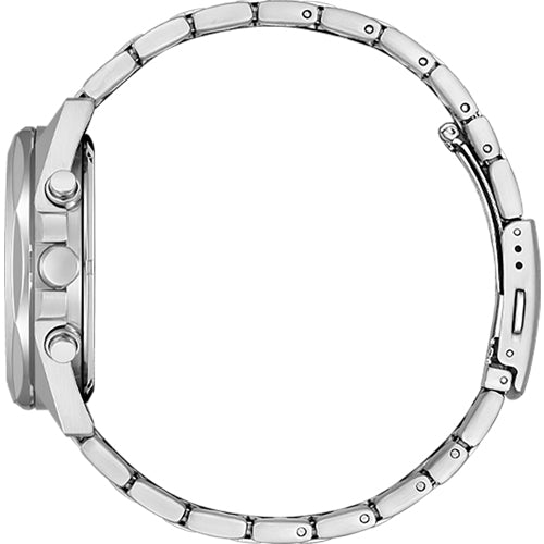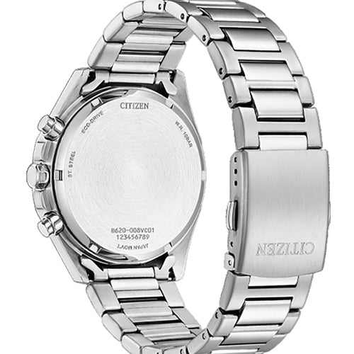Striking a perfect balance between functionality and elegance, the new Eco-Drive Chronograph watch is designed for the man with a keen sense of style and a demand for precision. The classic 41mm stainless steel case and bracelet exude a timeless charm, while the striking green dial provides a bold and versatile backdrop for the black subdials, reminiscent of a dense pine forest.The watch's Eco-Drive light-powered movement highlights CITIZEN‘s innovative approach to sustainable watchmaking, drawing power from any light source to offer a remarkable 9-month power reserve. This ensures uninterrupted performance without the need for battery changes, aligning with eco-conscious values.Its chronograph functionality is precise to 1/5 of a second and can record up to 60 minutes of elapsed time, making it an indispensable tool for timing everyday tasks or sporting events. Alongside this, the watch features a 24-hour display and a date function, both of which add layers of utility to its stylish facade.Protected by mineral glass and water-resistant up to 10 bar, this watch is built to endure the rigors of daily life. The fold-over clasp with a push button guarantees a secure and comfortable fit, ensuring the watch remains a constant companion, whether in a business meeting or on the racetrack.CITIZEN's commitment to excellence and innovation is evident in this watch, which offers not just a way to tell time but a sophisticated accessory for those who value reliability and style