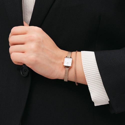 The cool corners of Quadro, shrunk down into our smallest watch ever. This Quadro Mini Lumine Bezel features carefully-set crystals and an interchangeable rose gold mesh strap.