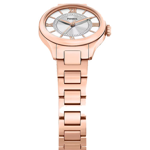 This rose gold-tone stainless steel watch features a small round case paired with a matching bracelet for a cohesive and polished look. The silver dial is finished with a satin and sunray effect, adding subtle dimension and depth to the design. Thoughtfully crafted, every detail—from the smooth bracelet links to the refined dial finish—speaks to quality and precision.