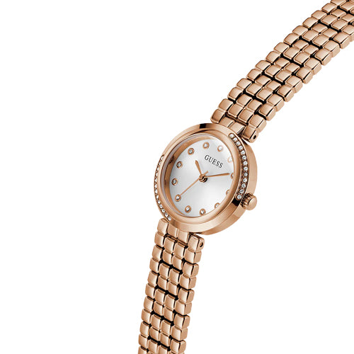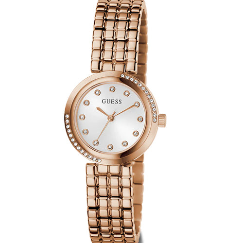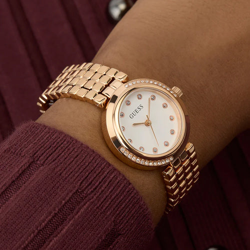 Exude elevated elegance with this beautifully crafted timepiece! This pretty 28 mm rose gold case showcases asymmetrical crystals on its bezel and is paired with a unique and beautiful bead-textured polished recycled steel rose gold bracelet. A crisp white sunray dial ties the look together!
