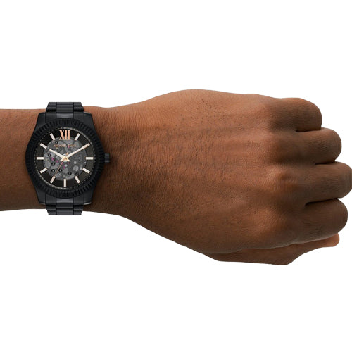 Bold and contemporary, this Lexington Automatic in black stainless steel is elevated with warm rose gold-tone accents on the skeleton dial for a dynamic pairing. Its self-winding movement is powered by the motion of the wearer, blending modern edge with traditional watchmaking in a design that commands attention.