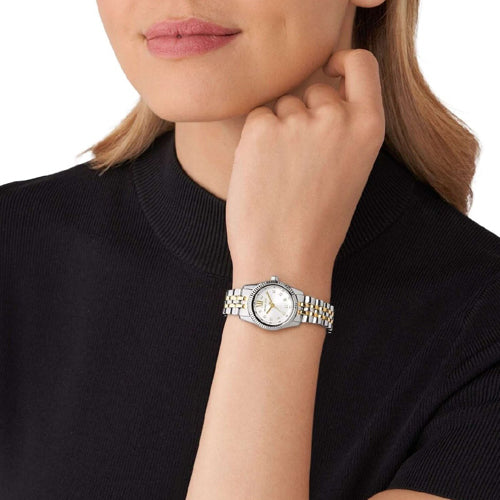 The Lexington watch exudes everyday glamour with its silver and gold hues and sparkling pavé accents. Made entirely of stainless steel, this mini timepiece boasts a round face with a beveled topring and a two-tone bracelet strap. Slip it on to give both day and night outfits a dose of sophisticated charm.