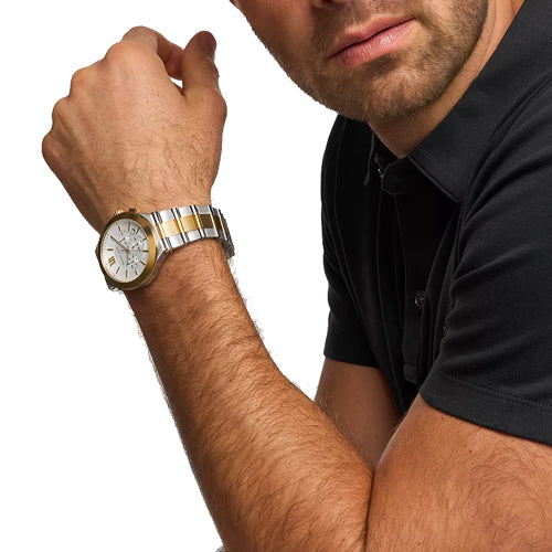 A modern take on sporty sophistication, the Billie watch stands out with its sleek, oversized silhouette and chronograph detailing. Crafted in two-tone stainless steel with a crisp white dial, it offers a polished and refined finish.