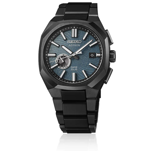 This Astron solar-powered timepiece is themed ‘Solidity,’ symbolising Seiko’s innovative spirit, present since the brand’s beginnings in 1881. Within a series taking inspiration from the solar system, this piece is inspired specifically by Earth. There are just 1,500 pieces of this limited edition available worldwide, with very few in the UK. Crafted in a super-hard 41.22mm titanium case with sapphire crystal glass, the distinctive ‘spiral galaxy’ dial pattern in dark turquoise blue is particularly difficult to create on a solar cell whilst maintaining its charge efficiency. This limited edition watch showcases a curved pattern within an all-black case accompanied by a ceramic bezel, like a galaxy in space. The dial features a glittered effect, depicting bright stars. This model has a contemporary feel, with sleek lines, slim profile, and compact, angular design and an almost seamless flow from the case, through the lugs and to the bracelet. The centre links have a mirror-effect and the micro-adjustable clasp feature adds a personalised fit. The watch is powered by an in-house built 3X62 Solar-powered movement with GPS functionality for exceptional accuracy – being updated remotely by GPS satellite when the wearer moves between time zones. It can be charged by any light source – either natural sunlight or artificial light – for convenience. Seiko Astron : the world’s first GPS solar watch – powered by light, automatically adjusted to your exact time through the latest satellite technology.Automatic hand position alignment function, Date display, Function to prevent the GPS signal reception (in-flight mode), GPS signal reception function (Time zone adjustment, automatic time adjustment, manual time adjustment), Overcharge prevention function, Perpetual calendar to the february 28, 2100, Power reserve indicator, Power save function, Reception result display function, Satellite acquisition status display function