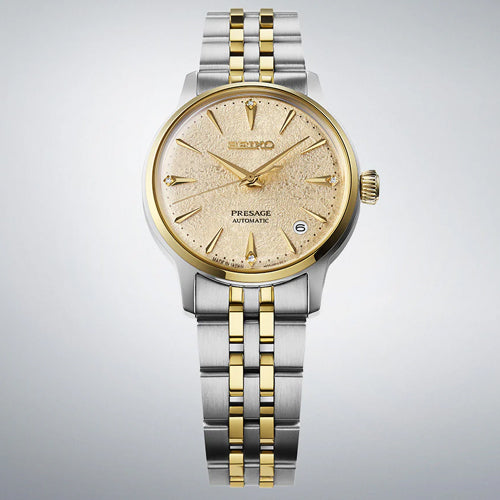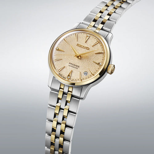Seiko Presage Cocktail Time watches are inspired by Japanese cocktail culture and specific drinks from the Star Bar in Tokyo’s sophisticated Ginza area – home to some of the city’s best cocktails. Crafted under the theme of ‘Daytime Cocktail Party,’ this piece is one of three frozen cocktail-inspired timepieces fit for Spring and Summer. This design is inspired by the ‘Frozen Banana Daiquiri’ drink, an icy mix of banana liqueur, brown sugar, lime juice, frozen bananas, and rum mixed by Star Bar’s Head Bartender, Mr Hisashi Kishi – International Bar Association World Champion and Japanese Government Contemporary Master Craftsman. Compact at only 34mm and featuring four diamond indices, this timepiece features a light yellow textured dial that resembles crushed ice. It features a tapered and mirror-finished multi-link bracelet. Powered by an in-house 4R35 automatic calibre, accurate to +45 / -35 seconds per day with a 40-hour power reserve. Seiko Presage: Timeless looks, precise mechanical timekeeping. Minimalistic watch designs with a distinctly Japanese aesthetic.