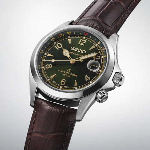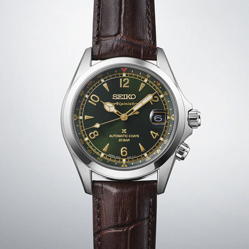 From the Alpinist collection, first launched in 1959, these watches were designed for Japanese ‘Yama-otoko’ mountain men, to be reliable in treacherous terrain., Under the sapphire crystal glass, the archive-inspired classic pine green is complemented by ‘cathedral style’ hour and minute hands, accompanied by classic Arabic numerals and wedge-shaped indices. It features the traditional Alpinist logo under the Seiko logo, which featured on the very first 1950s Laurel Alpinist. The ‘Mountain Device’ logo features on the caseback of these watches, an aspect of the vintage original indicating the field nature of the watch. The case has an applied super-hard coating for increased scratch resistance and shine., Through the exhibition case back, the in-house automatic 6R55 calibre can be viewed, accurate to -15/+25 seconds per day, with a power reserve of 72 hours., Prospex is a combination of the words ‘Professional’ and ‘Specifications.’ Seiko Prospex timepieces are designed to be practical, reliable and durable; to meet the high standards required in extreme environments for sports lovers and adventure seekers alike.