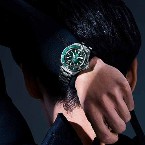 This Seiko Prospex diver’s watch has been created in collaboration with PADI – the Professional Association of Diving instructors, the world’s most recognised diver’s training organisation. It commemorates 60 years of Seiko watchmaking heritage in Diver’s watches. Continuing the Seiko heritage of watchmaking innovation and design evolution, this Prospex diver’s watch is evolved from a combination of two popular Seiko designs. Nicknamed by fans for their unique case shapes, the ‘Samurai’ and ‘Shogun’ are popular Seiko models which are angular in shape and instantly recognisable. This latest Compact diver’s watch takes elements from both heritage designs, as well as adding modernised features. Aesthetically, the green dial depicts the surface of the ocean seen by a diver underwater, with the sunlight pouring through. It takes the steep angled lugs of the Shogun and echoes the crown design of the Samurai model with the straight contours of both blueprints. In terms of size, this piece has a compact 41.7mm diameter case and slim design for comfortable wearability. Its new features include a date window at 4.5 o’clock, pointed hands, and a bracelet with press-formed integral links for an elegant feel that matches the linearity of the case. This watch is compliant with the recognised ISO standards for professional diving watches. It is water resistant to 200m. Prospex is a combination of the words ‘Professional’ and ‘Specifications.’ Seiko Prospex timepieces are designed to be practical, reliable and durable; to meet the high standards required in extreme environments for sports lovers and adventure seekers alike.