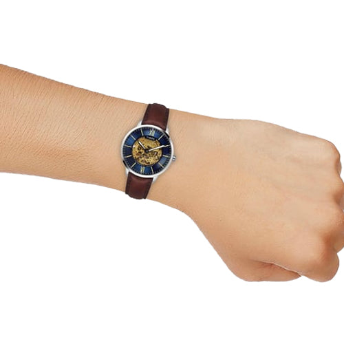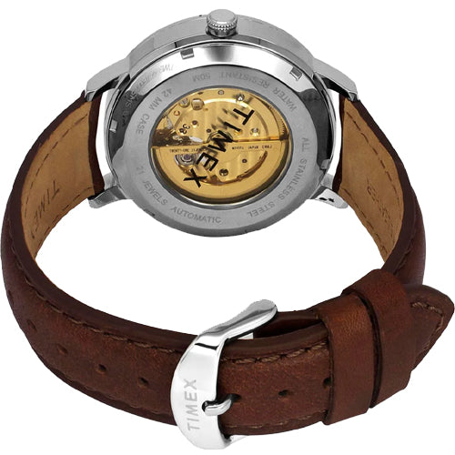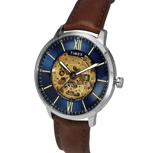 Bedazzle those in your presence with this men's analog watch from Timex. Encased in a 42 mm case, the blue round dial features plain 3-hand functionality with a quartz movement. The genuine leather strap comes in a brown hue that further elevates the look of the watch. Besides, it has water resistance up to 50M and a buckle to ensure a secure fit on your wrists.