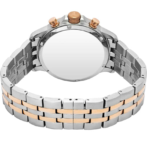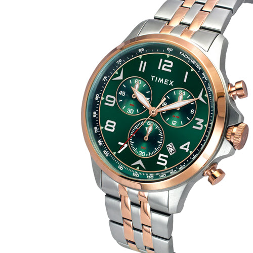 Add smartness to your personality by wearing this men's analog watch by Timex. Operated by a quartz movement and safeguarded by a mineral glass, the green round dial is encased in a 47.7 mm case. It features chronograph. The stainless steel strap comes in a silver & rose gold hue that further elevates the look of the timepiece. Moreover, it is fitted with a deployment clasp to ensure a secure fit on the wrist.