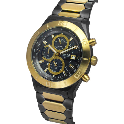 Set in a high shine case, this men's analog watch by Timex is sure to catch your attention. Operated by a quartz movement and safeguarded by a mineral glass, the grey round dial is encased in a 44 mm case. It features chronograph. The stainless steel strap exudes a grey & gold hue that accentuates the look of the watch. Moreover, it is fitted with a clasp that ensures a secure fit on the wrist.
