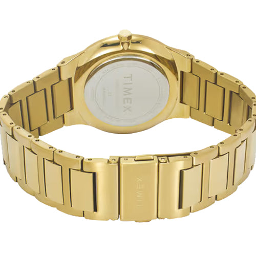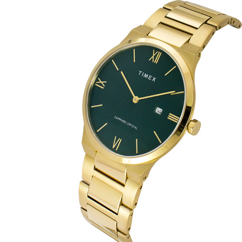 Style and performance perfectly combine together to form this men's analog watch that is brought to you by the collection by Timex. Operated by a quartz movement and safeguarded by a sapphire, the green round dial is encased in a 41 mm case. It features plain two hands. The stainless steel strap comes in a gold hue that further elevates the look of the timepiece. Moreover, it is fitted with a push-button clasp to ensure a secure fit on the wrist.
