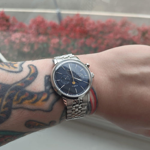 Our Marlin Moon Phase Multifunction pays tribute to the great minds that propelled mankind to the moon with a sub-dial that faithfully mirrors the lunar cycle. This gorgeous rendition of our ‘60s Marlin features a sophisticated 40mm stainless-steel case and a calendar movement with sub-dials that indicate the day of the week, the month, and the date. The dial is complete with hand-applied indices and appears in timelessly rich colors, paired with an adjustable stainless-steel bracelet.