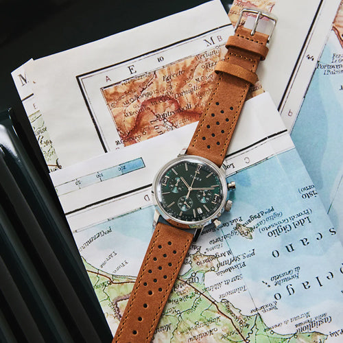 Our Marlin Chronograph Tachymeter boasts the distinction of being the first chronograph in our Marlin line, as well as the first Marlin powered by a quartz movement. This beautifully detailed rendition features a tachymeter index along its outer minute track to measure speed, a unique date window placement, and a perforated natural leather strap. Though its build breaks new ground in our watchmaking heritage, this timepiece retains the classic Marlin features with a sturdy stainless-steel case, domed acrylic crystal lens, and retro-style square markers at 3, 9, and 12 o'clock.