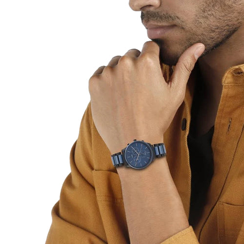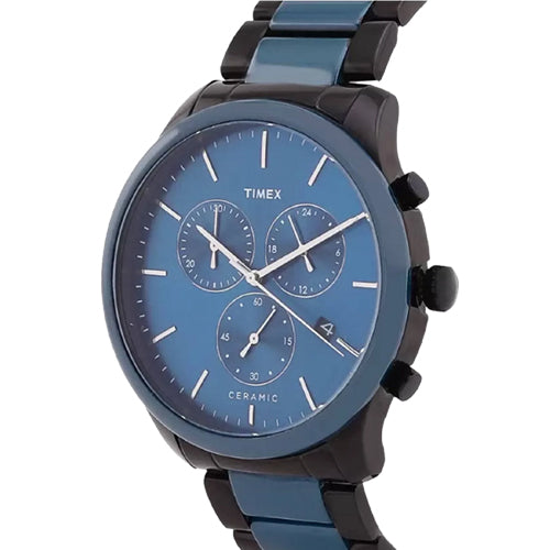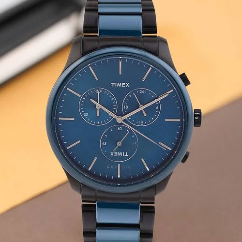 Add a stylish dimension to your look by wearing this casual men's analog watch from Timex. Covered by a mineral glass, the blue round dial is nestled in a 43 mm case. It vaunts chronograph. The stainless steel strap exudes a two tone hue that accentuates the look of the watch. Moreover, it is fitted with a deployment clasp with push button clasp that ensures a secure fit on the wrist.