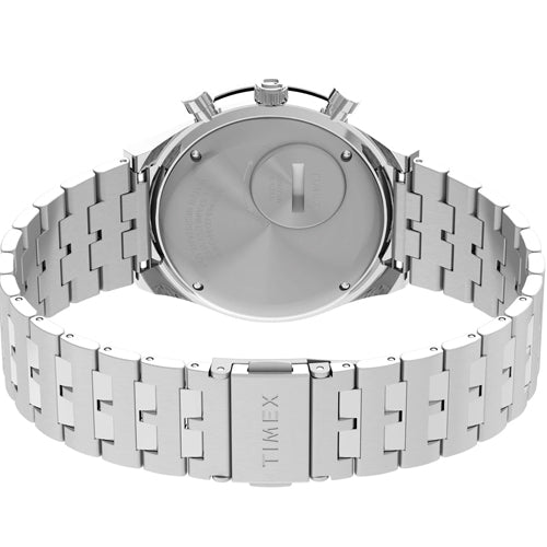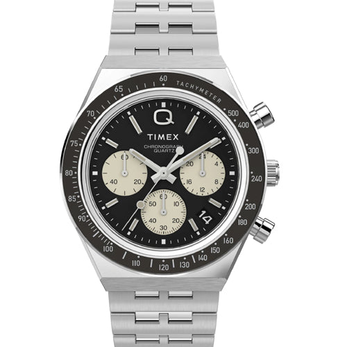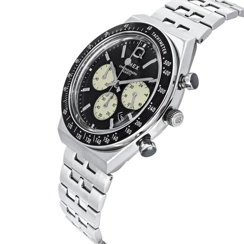 Roar across the finish line with our high-performing Q Timex Chronograph. Inspired by the original motoring watches that graced the tracks of Europe’s most iconic races, this timepiece celebrates the endurance of our legendary 1970s Q Timex. An ultra-precise chronograph movement and black tachymeter bezel recreate the finesse and function of a true racing watch, allowing you to determine elapsed time and average speed like the greatest daredevils in motorsports. Contrasting sub-dials, a date feature, hand-applied dimensional indices, and an updated Q Timex logo smolder against a jet-black dial, while a brushed and polished stainless-steel case and crown bring dynamism and durability to its retro construction. Infinitely wearable, an adjustable stainless-steel bracelet makes for a sporty presentation that’s ready to hit the road whenever you are.
