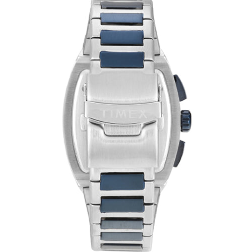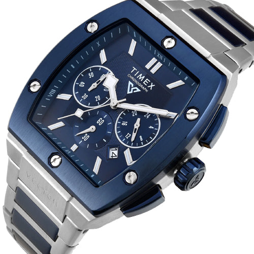 Look stylish by donning this men's analog watch from the Vector collection by Timex. Its stainless steel strap exudes a two tone hue that accentuates the look of the watch. Safeguarded by a mineral glass and operated by a quartz movement, the blue tonneau dial is encompassed in a 41.5 mm case. It features chronograph. Furthermore, it is complemented with a fold-over clasp with safety clasp that ensures a secure fit on the wrist.