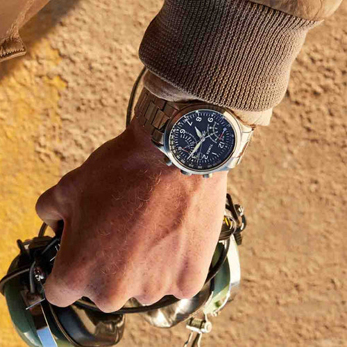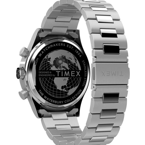 Built with our proprietary fly back chronograph movement designed in Pforzheim, Germany, the dial of our Waterbury Traditional Fly Back Chronograph houses fan-shaped sub-dials at the 4 o'clock and 10 o'clock positions with retrograde hands. A single press of the fly back pusher instantly resets the chronograph to display the current time in the current lap without the need to stop and reset, and when the chronograph isn't in use, the upper sub-dial doubles as a second time zone indicator. This watch boasts a robust 43mm stainless-steel case paired with an adjustable stainless-steel bracelet. Other notable details include a date window positioned at 2:30, luminous hour and minute hands for enhanced visibility, 100m of water resistance, and the iconic stylized W of the Waterbury Watch Company logo displayed on the crown, sweep second hand, and beside the 7th hour marker.