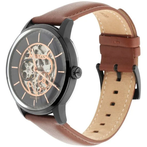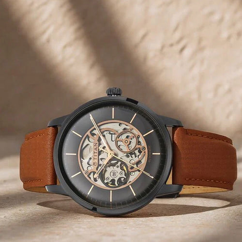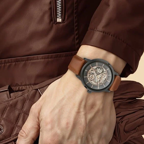 This luxurious automatic watch exudes elegance and precision, featuring a sleek black exhibition skeletal dial that offers a mesmerizing view of the high-precision automatic calibre inside. The neutral silver inner mechanism, highlighted with steel accents, creates a striking contrast against the dark dial. Shining golden indices and hands add a sophisticated touch of luxury, ensuring readability with a refined glow. Finished with a classic tan brown leather strap, this timepiece seamlessly combines style and durability. Perfect for both formal events and everyday wear, it pairs beautifully with a tailored suit or a casual outfit for a timeless, polished look.