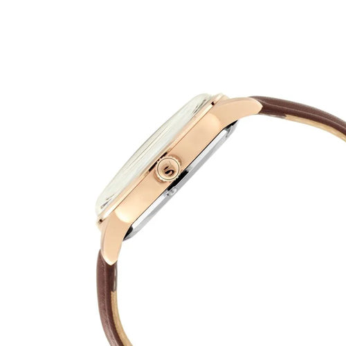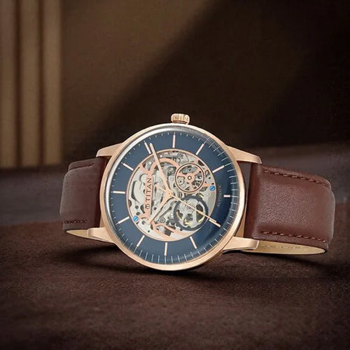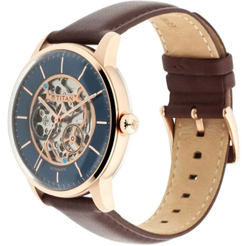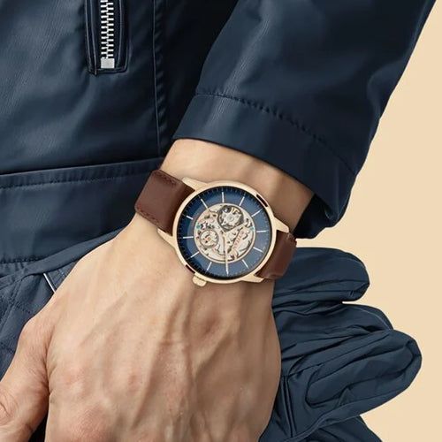 Elevate your workwear with a dark blue sectoral dial, automatic function, and gold accents. The intricate design, complemented by a brown leather strap with light blue rivets, creates a beautiful watch that seamlessly combines functionality with style.