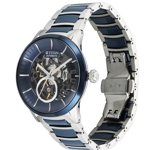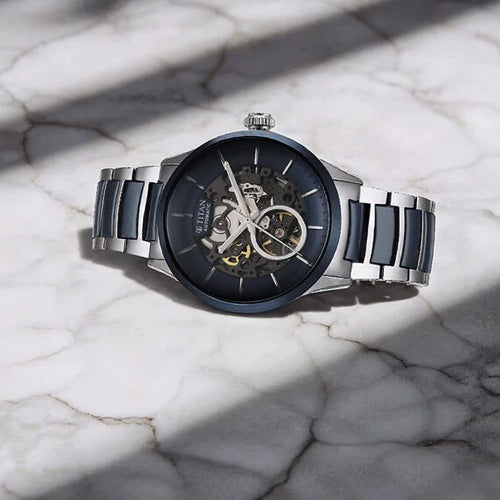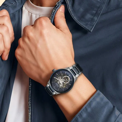 Step into the trends by styling this blue and silver watch with a standout feature - the in-house automatic movement 7A20-S with 22 jewels, ensuring precision within -10sec to +30sec/day and a 36-hour power reserve, all elegantly showcased through a skeletal dial face. The dual-tone solid link stainless steel and ceramic bracelet, coupled with angle-cut hands and a plated bezel ring, embodies refined aesthetics. The domed crystal with a concave dial adds a touch of modern charm. This versatile timepiece seamlessly transitions from day to night, a perfect fusion of automatic mastery and chic ceramic allure.