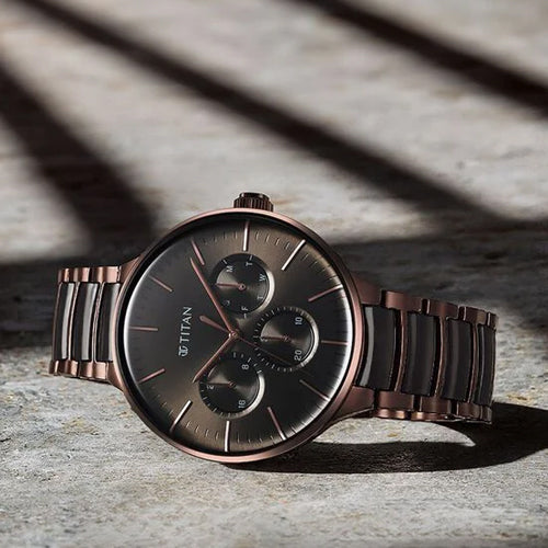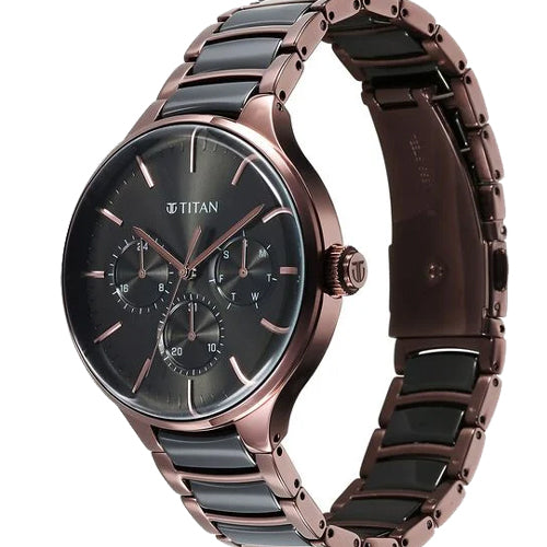 Add a stylish dimension to your look by wearing this men analog watch from Titan. Covered by a mineral glass, the black round dial. It has a crown for time adjustment. The stainless steel strap exudes a multi hue that accentuates the look of the timepiece. Moreover, it is fitted with a fold-over clasp with double push button safety clasp that ensures a secure fit on the wrist.