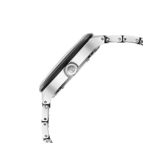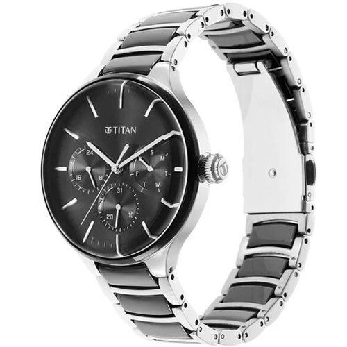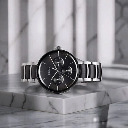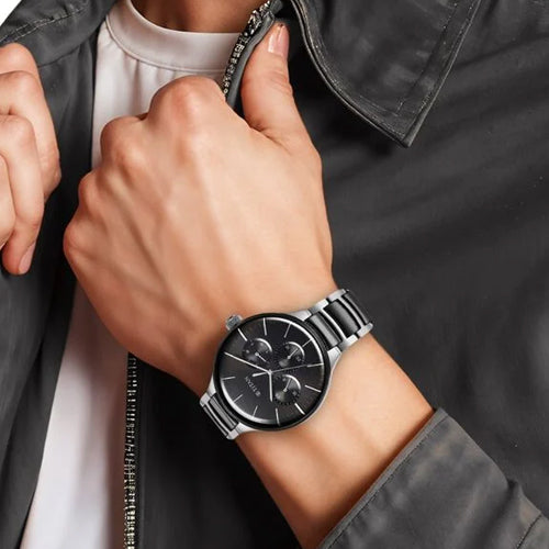 This watch boasts an all-black dial with multifunction sub-dials, sleek silver indices, and hands, complemented by a shining silver case and a dual-tone solid stainless steel bracelet in silver and black ceramic. The crystal dial adds a touch of sophistication, making it perfect for a refined workwear look. Pair this watch with a tailored black suit and silver accessories for a sleek and professional ensemble.